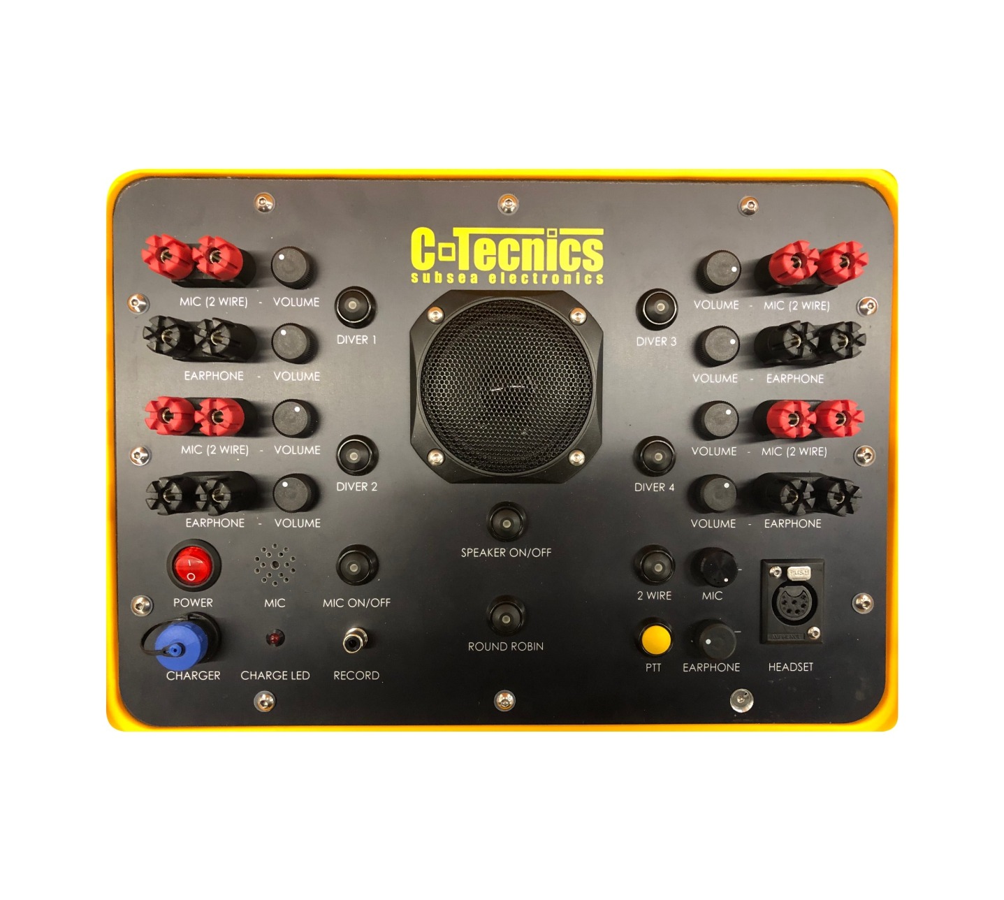 The system provides full round robin communications between the tender, two working divers and one standby diver. An additional channel allows communication with other personnel, such as deck support crew.