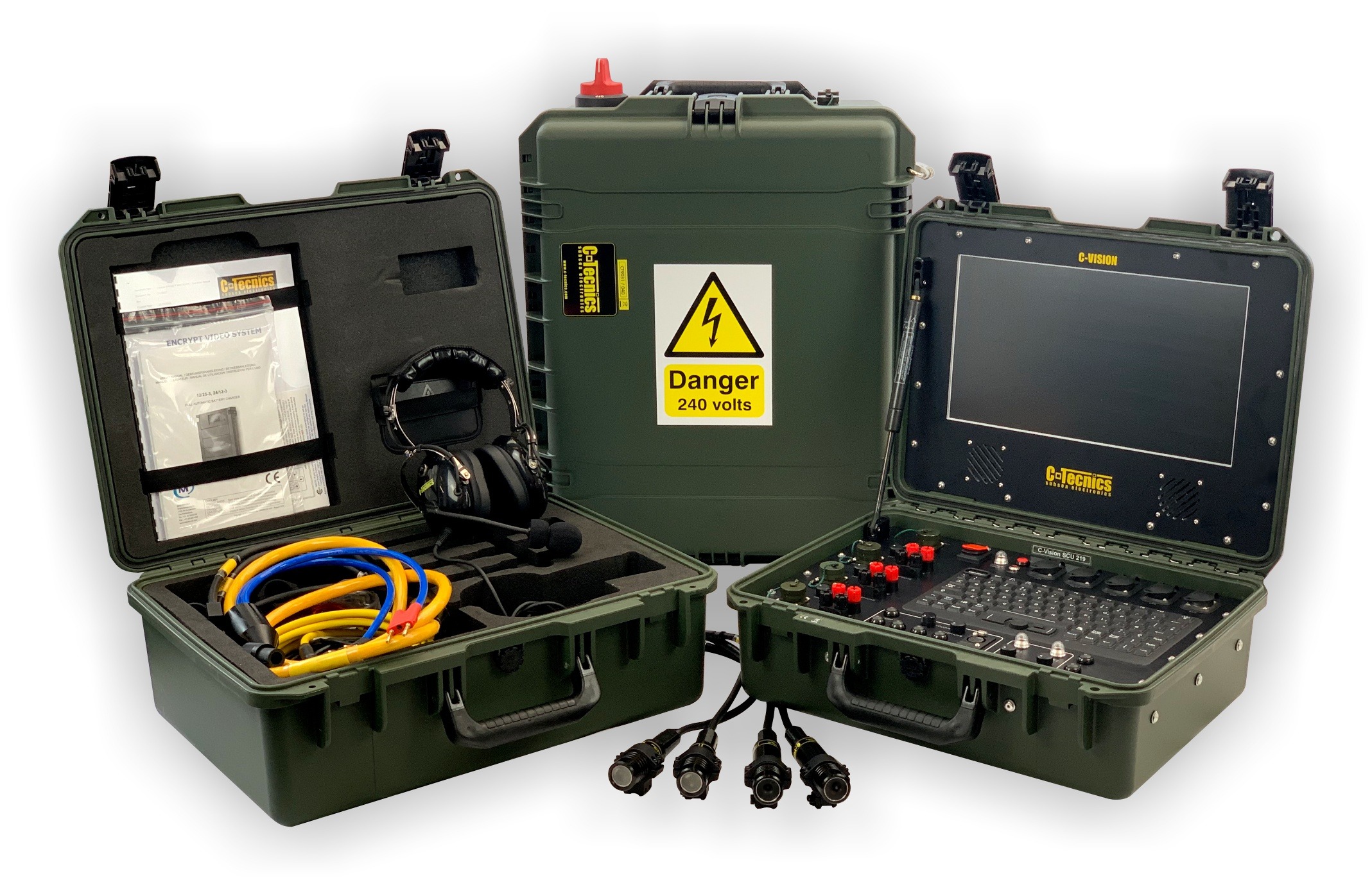 The system enables both video and voice communications to be monitored and recorded within a single rugged and easy-to-operate unit. Compared to the standard C-Vision system, the Encrypt variant supports 4-wire (round robin) communications, alongside enhanced connectivity through military-specification umbilical connectors and direct interface connections.
